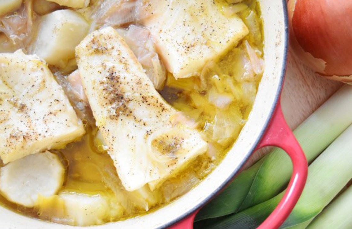 Προσθέτετε τα κομμάτια του μπακαλιάρου και αφήνετε το φαγητό να μαγειρεύεται, ενώ παράλληλα ετοιμάζετε το χυλό: Σε ένα μπολ, βάζετε το χυμό από τα λεμόνια, το αλεύρι και χτυπάτε μέχρι να γίνουν χυλός.
